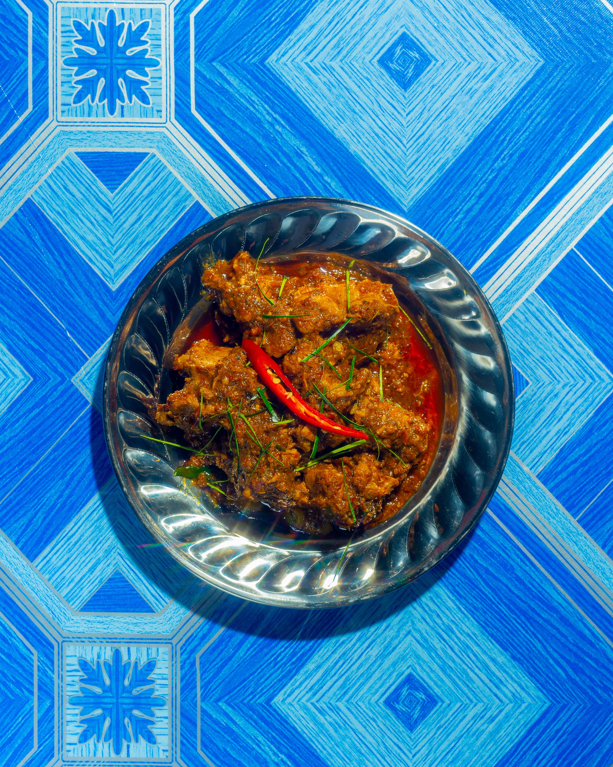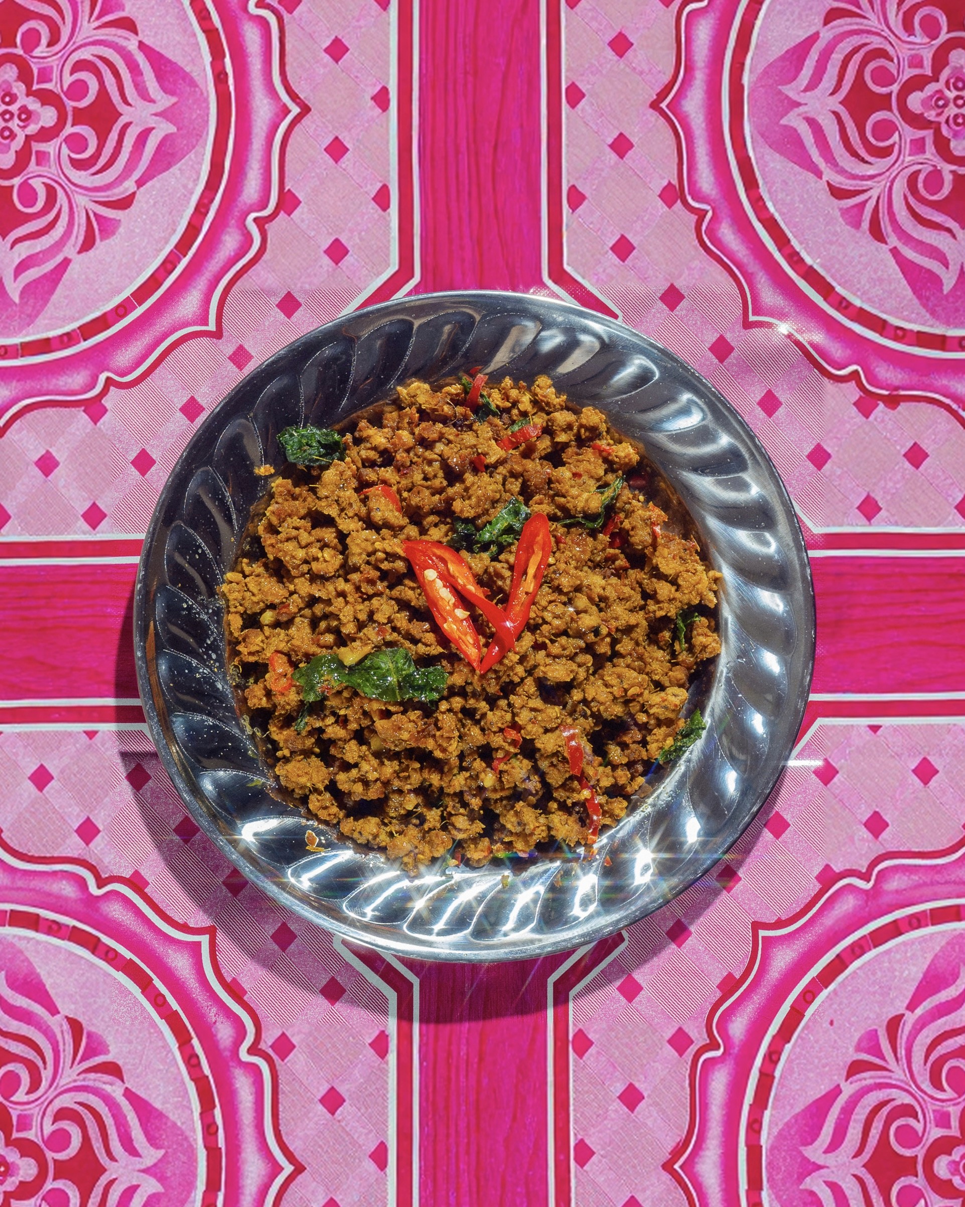เนื้อวัวออสเตรเลียบด คั่วกับเครื่องแกงใต้ ตะไคร้ ขมิ้น ใบมะกรูด และพริกแห้งใต้ เผ็ดร้อนแรงแบบมีไฟในตัว กลิ่นหอมควันกระทะ กับความเผ็ดที่ช็อตปลายลิ้น