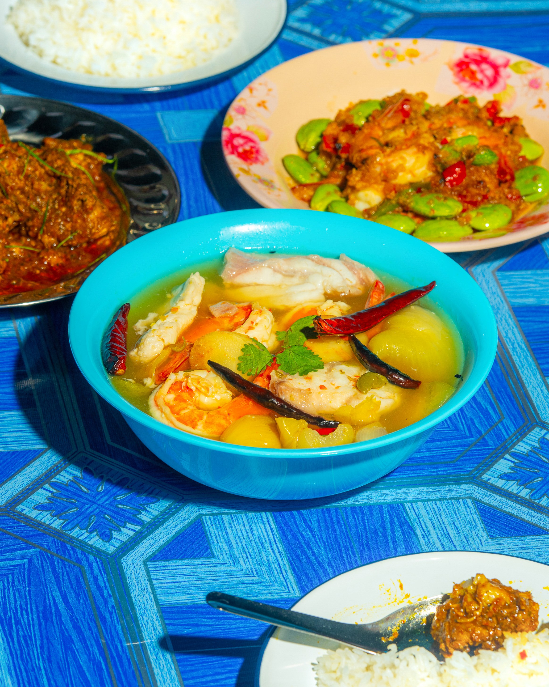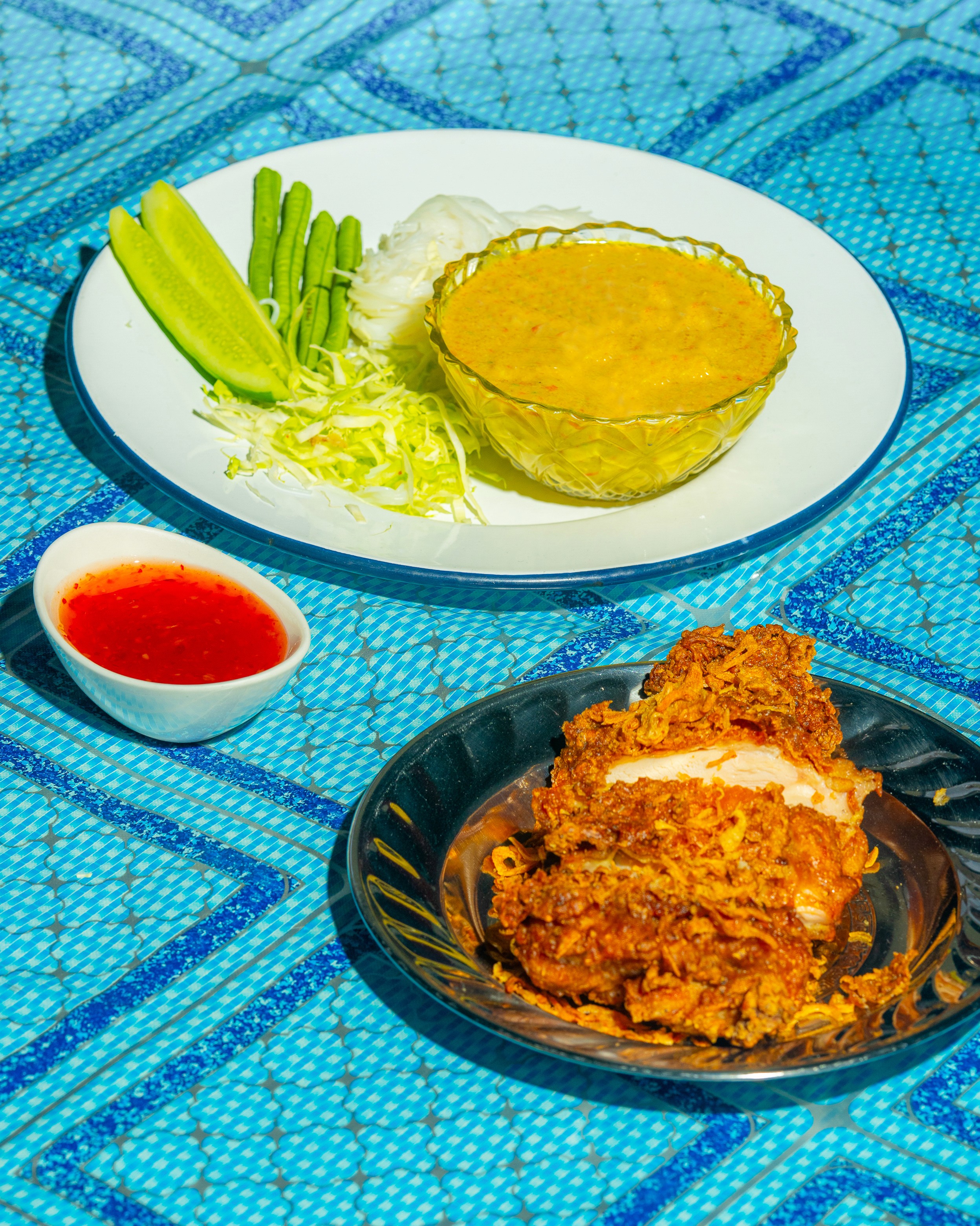 แกงกะทิปูเนื้อโต หนมจีน 1 ชุด, เลือกระหว่าง แกงส้ม หรือ ต้มจิกโก๋, ไก่ทอด 2 ชิ้น กรอบนอกนุ่มใน, แกงจืดใบพายซดคล่องคอ, น้ำพริกกะปิรสจัดจ้าน ผักเคียง, ข้าวหอมมะลิ