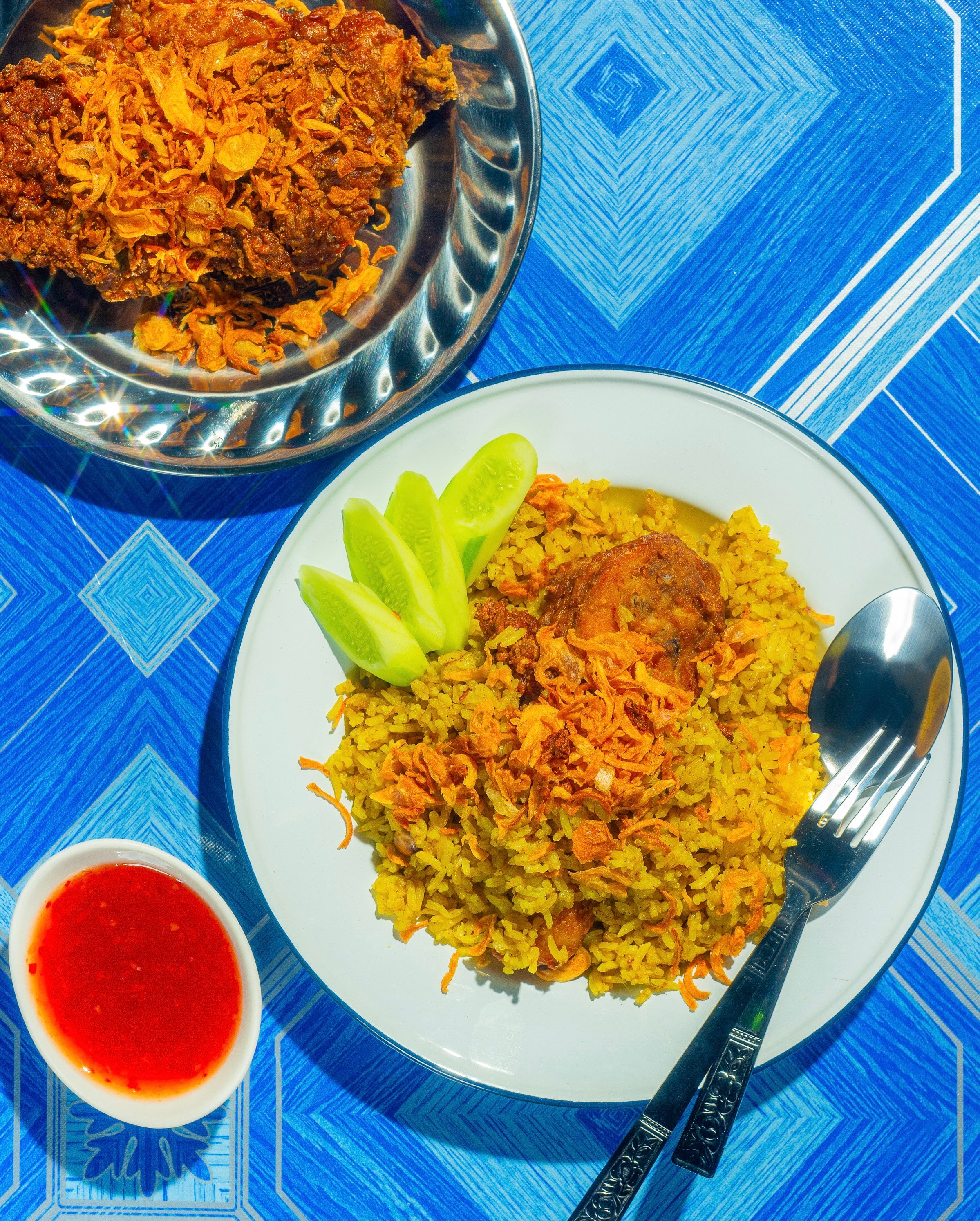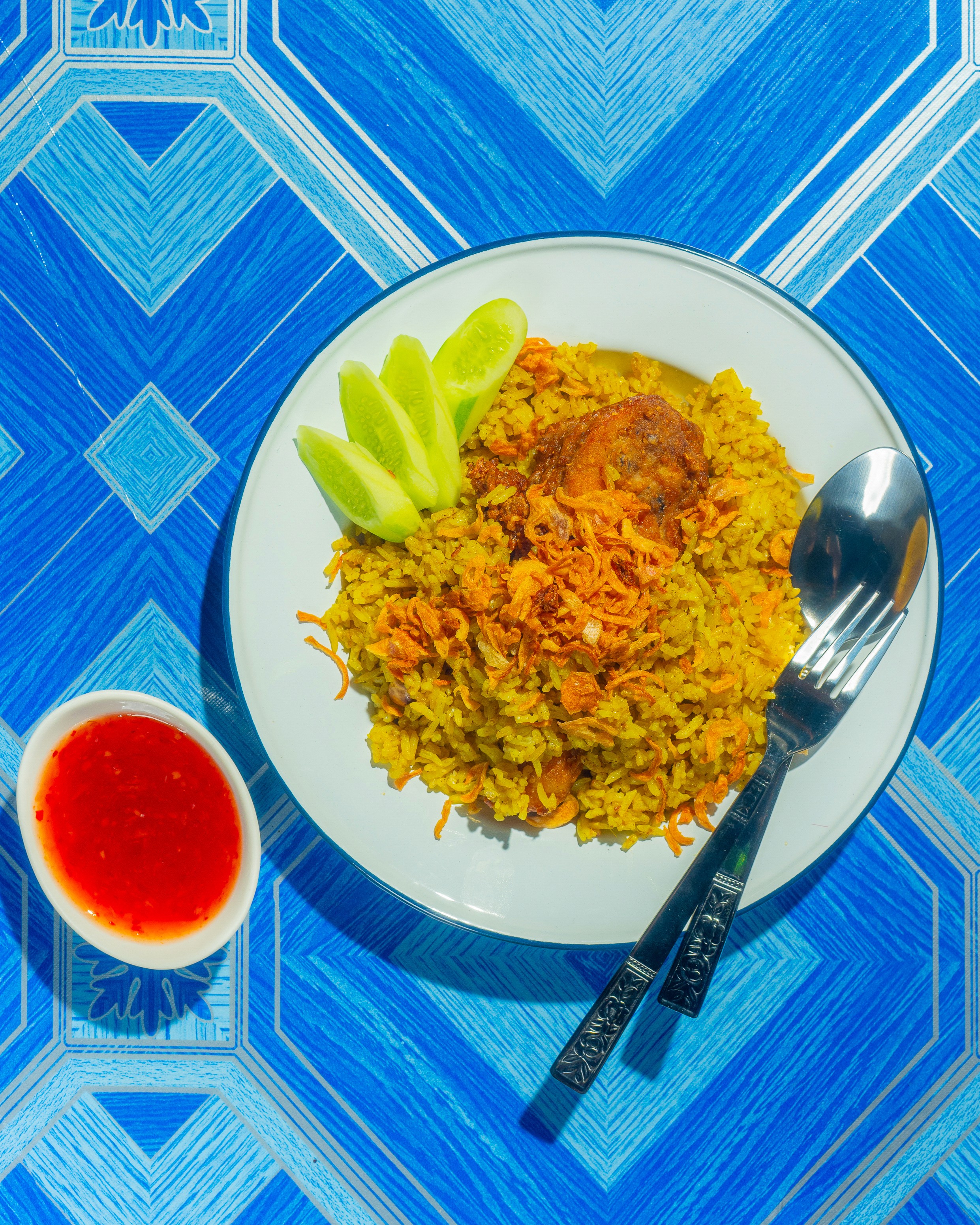 ข้าวหมกเหลืองทองอร่าม นายหัวคัดเอง ไม่ใช่ข้าวธรรมดา — เราเลือกใช้ข้าวหอม Basmati เรียวยาว หมกพร้อมเครื่องเทศหลายชนิดจนหอมเหลืองทอง รสละเมียด กินคู่กับแกงใต้เผ็ดๆ ลองดูตะ!